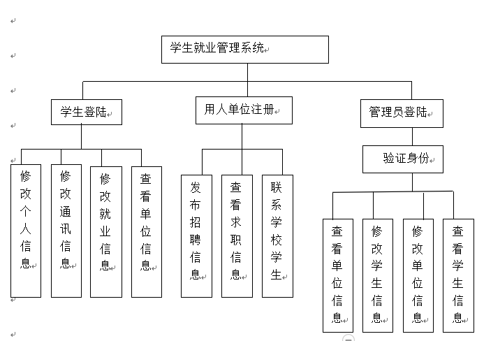 系统的主界面主要提供毕业生、企业单位(先注册才可以登入)、管理员三大入口,根据用户类型,进入不同的服务页面。整个系统主要由毕业生管理、单位管理、管理员维护、就业动态、数据库备份、数据库恢复、等子系统组成。