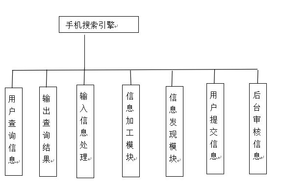 搜索引擎系统功能模块图,也就是搜索引擎的原理图。根据毕业设计要求,我要完成的功能是两大的模块的功能:信息发现模块和信息加工模块。其中,信息发现模块就是信息搜索模块,信息加工模块就是信息处理程序,并由此模块完成向数据库存储信息的功能。