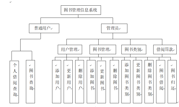 管理员部分:可以进行图书管理和用户管理。图书管理包括添加图书类别、修改图书类别、删除图书类别、添加新的图书信息、修改图书信息、删除图书信息,借阅图书包括图书借书和还书以及超期罚款。